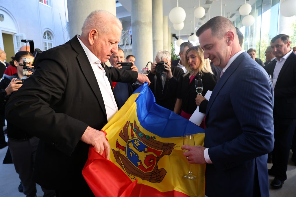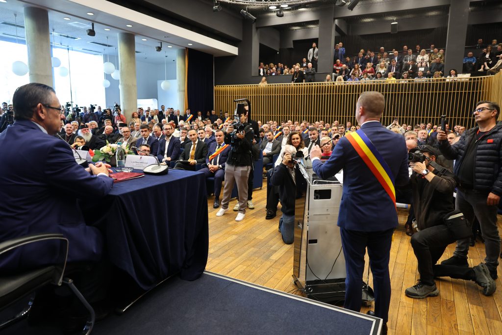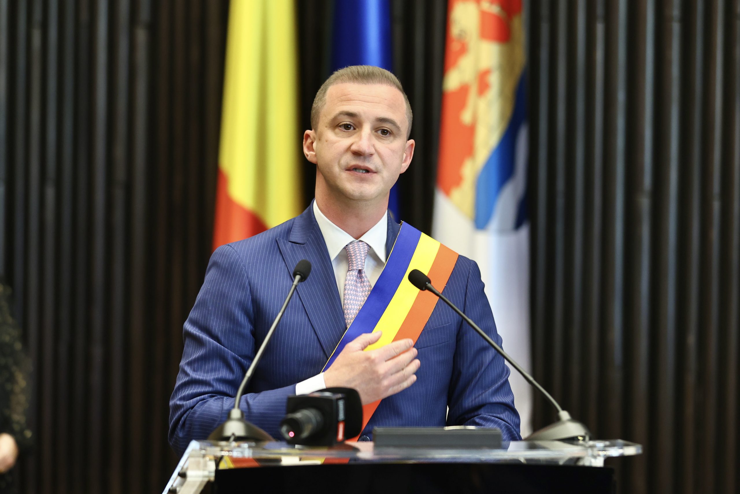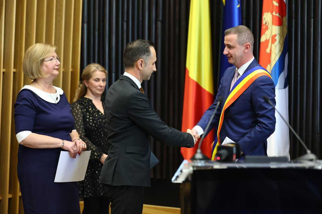 Apoi, Alin Nica i-a înmânat eșarfa tricoloră noului președinte al CJ Timiș.