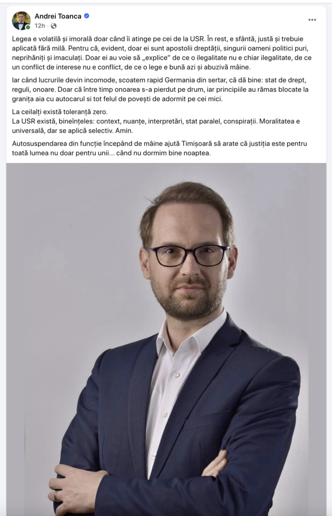 „Autosuspendarea din funcție începând de mâine ajută Timișoara să arate că justiția este pentru toată lumea nu doar pentru unii… când nu dormim bine noaptea”, a precizat Andrei Țoancă.