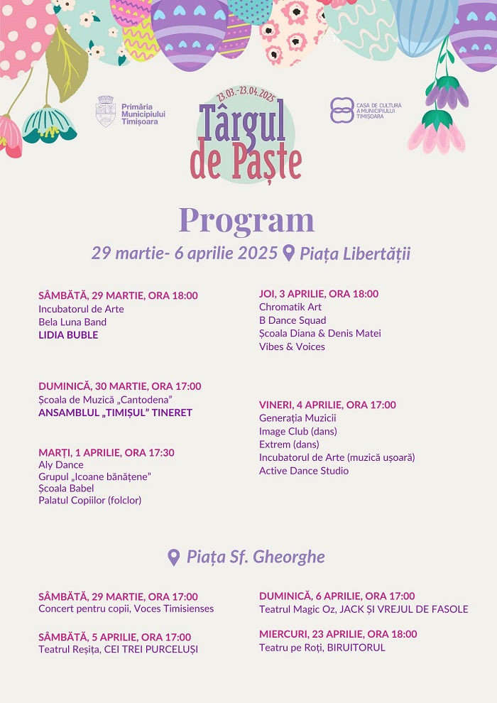 „Al doilea weekend al Târgului de Paște oferă o mulțime de evenimente și activități pentru vizitatorii mari și mici. Sâmbătă ne întâlnim în Piața Libertății, de la ora 18, pentru o seară de muzică cu Bella Luna Band și Lidia Buble. Duminică, de la ora 17, ne încântă talentele locale: Școala de Muzică „Cantodena” și Ansamblul „Timișul” Tineret”, a informat Primăria Timișoara.