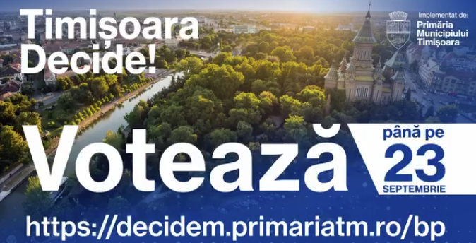 Primăria Timișoara a dat, vineri, start votului pentru cele 45 de proiecte selectate în cadrul campaniei de bugetare participativă din acest an. Pentru ca timișorenii să dezvolte comunitatea de care aparțin, cu sprijinul primăriei, este necesară o mobilizare la vot până în 23 septembrie.