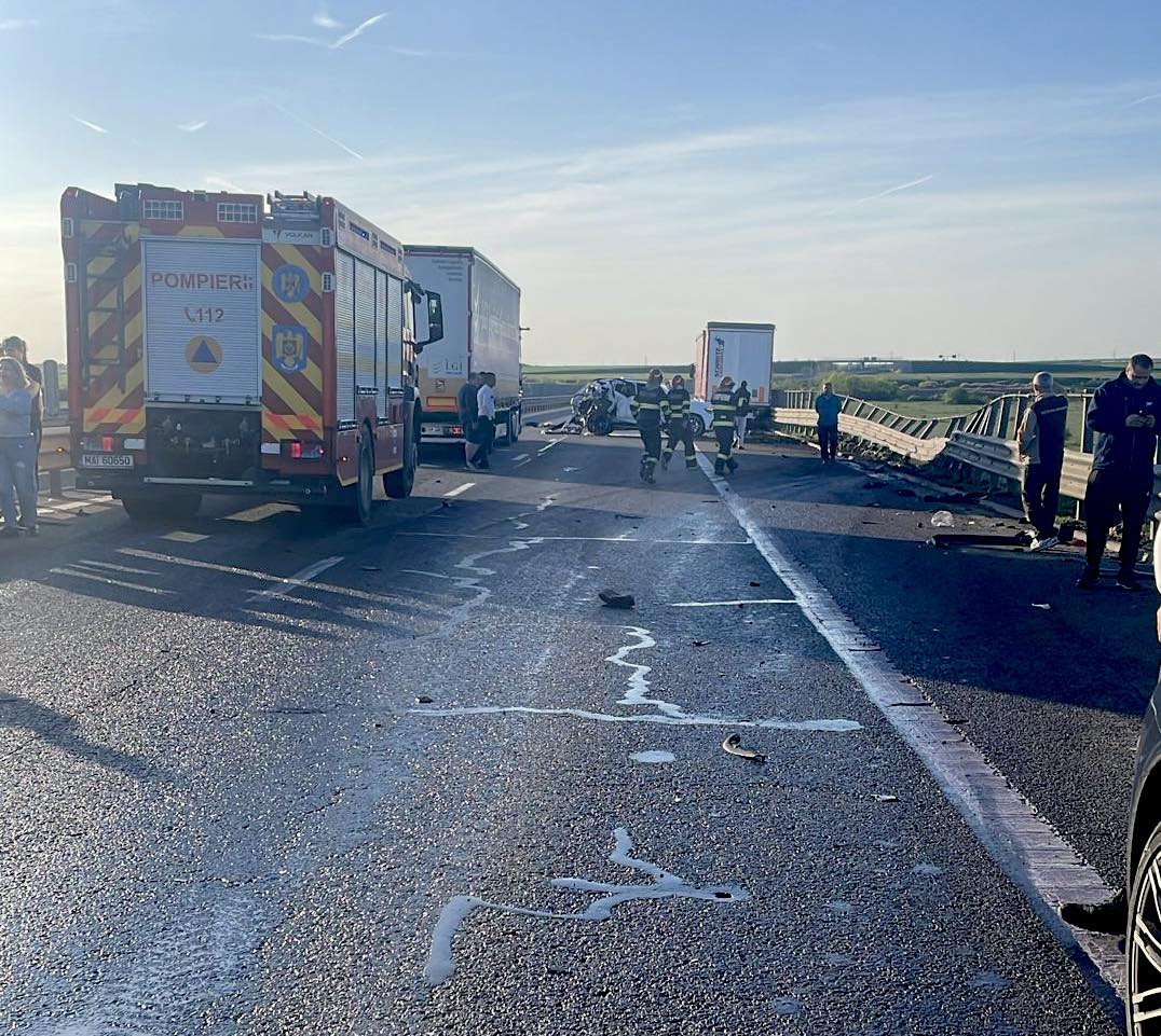 „Luni, 06.04.2026, în jurul orei 18:25, am fost solicitați să intervenim pentru asigurarea măsurilor PSI și prim ajutor în urma unui accident rutier produs pe A1 km 504 (sensul de mers spre Arad). La locul evenimentului s-au deplasat de urgență pompierii din cadrul Detașamentului 1 Timișoara și Punctului de Lucru Pișchia cu o autospecială de primă intervenție si comandă, o autospecială de stingere cu modul de descarcerare și un echipaj SMURD cu medic, precum și o ambulanță SAJ. În accidentul rutier sunt implicate un autotren și cu autoturism cu platformă”, a informat ISU Timiș.