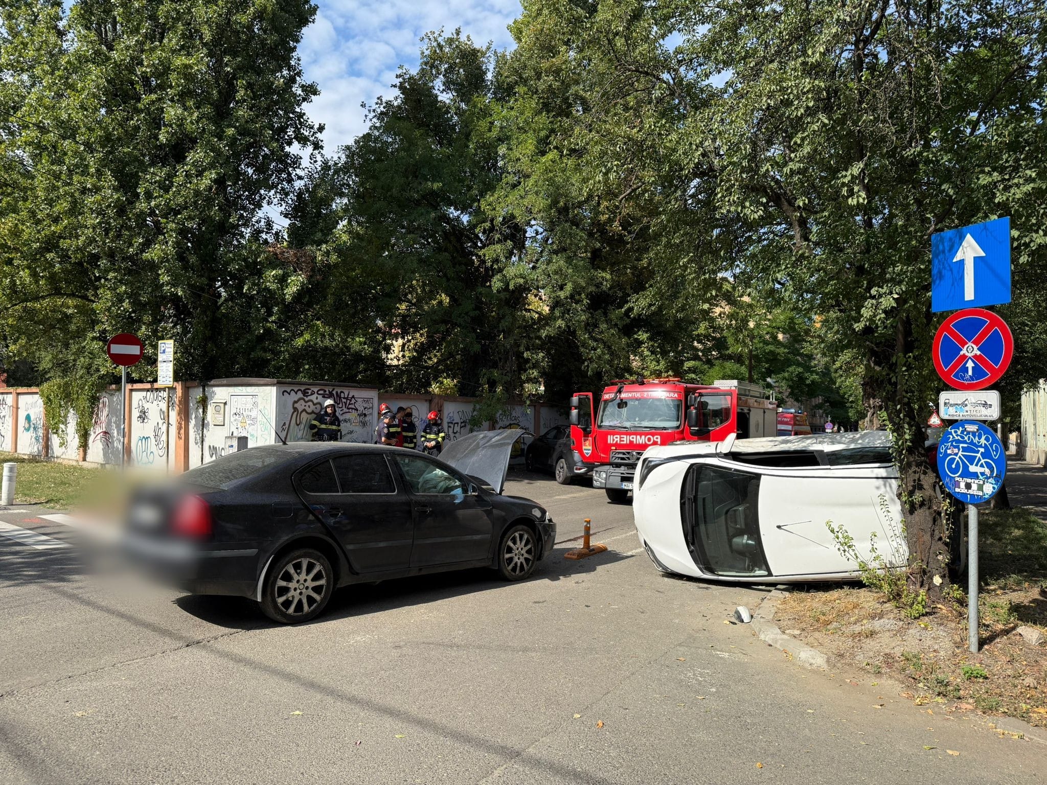 Un accident rutier a avut loc, sâmbătă, într-o intersecție din Timișoara, în urma căruia o mașină s-a răsturnat.