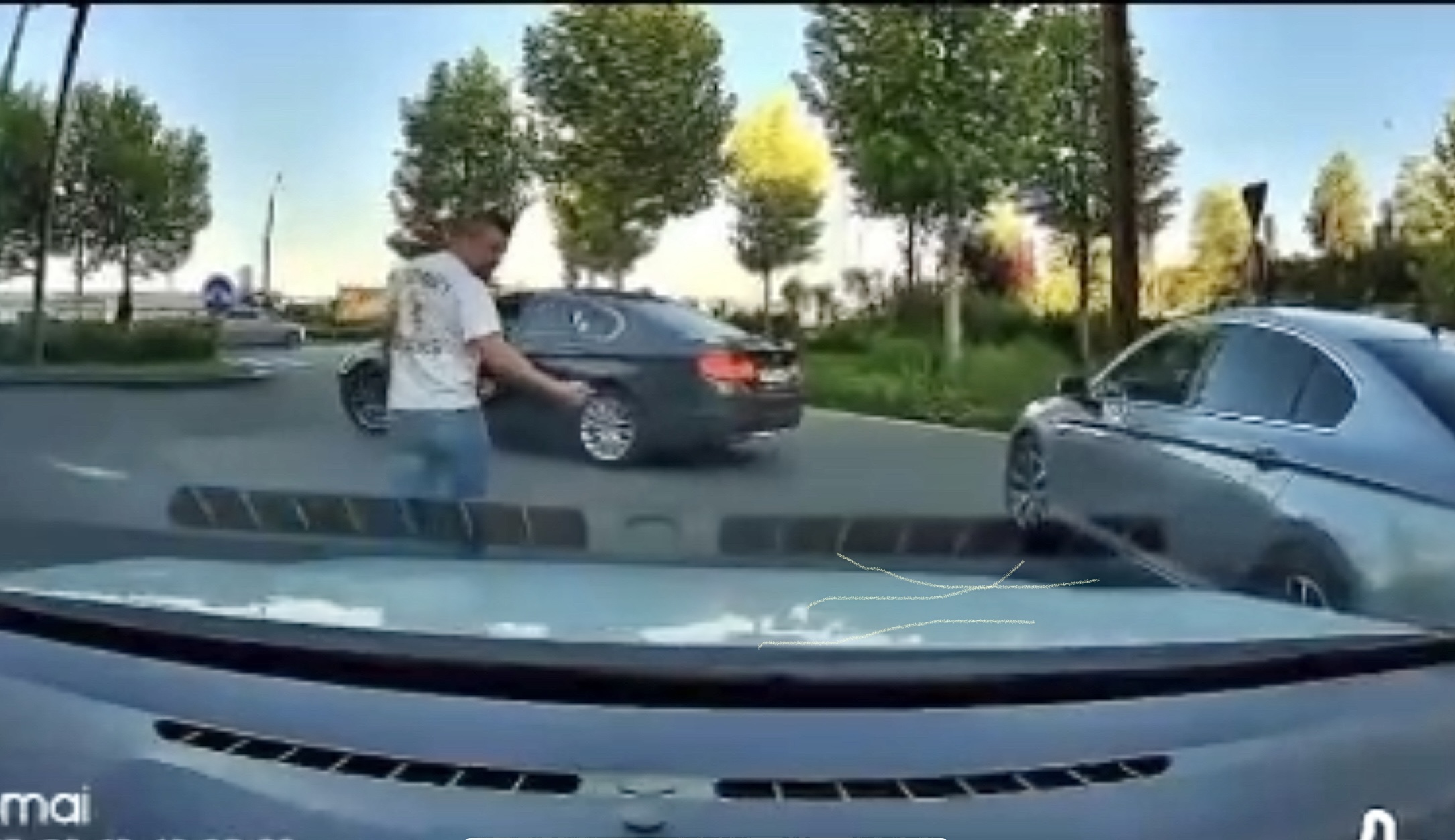 Potrivit imaginilor, conflictul a pornit de la o șicanare în trafic. Unul dintre conducătorii auto i-a tăiat calea celuilalt, iar în loc să își continue drumul, a oprit brusc în mijlocul carosabilului. A coborât nervos din mașină și s-a îndreptat amenințător spre celălalt participant la trafic.